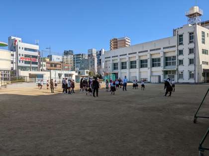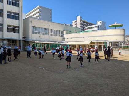 今日は6年生が1年生と交流会をしました。円形のドッチボールで、中の人たちを当てていきます。6年生を当てた1年生は大喜びです。