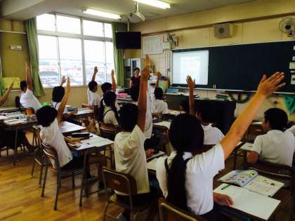 担任の先生は、『書画カメラ』を使って問題を映し出し、子ども達に問いかけています。