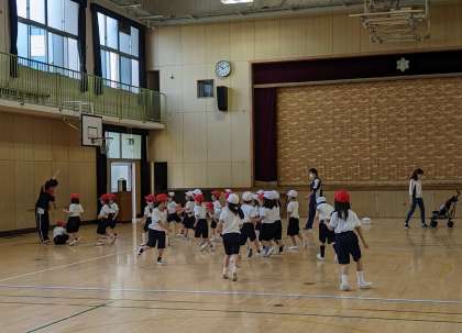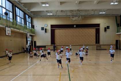 広い講堂で、体育をしました。上手に集合して整列したあと、鬼ごっこをして走り回りました。「いろいろなぁに色」の掛け声で、言われた色を探して全力で走り出しました。笑顔がいっぱいでした。