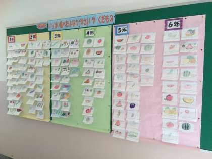 5・6年理科の自由研究、4年壁新聞、「夏休みいっぱい食べたよ夏野菜とくだもの」