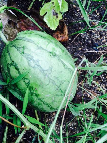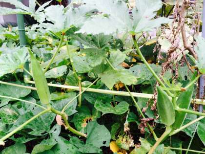 学校の学習園では、スイカとオクラが順調に実ってきました。