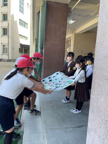 入学してしばらくの間、給食の用意を助けてもらった6年生のお兄さん・お姉さんに「お世話になりました」「ありがとう」とお礼のメッセージを届けた1年生。お礼のたくさんのおにぎりには、一つ一つすてきなメッセージと名前が上手に書かれていました。受け取った6年生も素敵な笑顔で、とてもうれしそうでした。