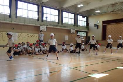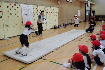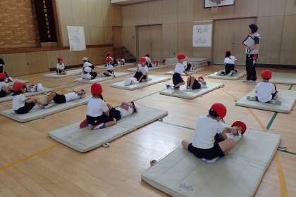 講堂で1年生・2年生が上体起こしや立ち幅跳び、反復横跳びに挑戦しました。足を持ってもらって、体を起こしてくる上体起こしでは、何回できるかチャレンジしていました。立ち幅跳びでは、膝を上手に使って、エイヤっと跳びました。反復横跳びでは、素早く横にステップしながら、回数を友達に数えてもらいました。