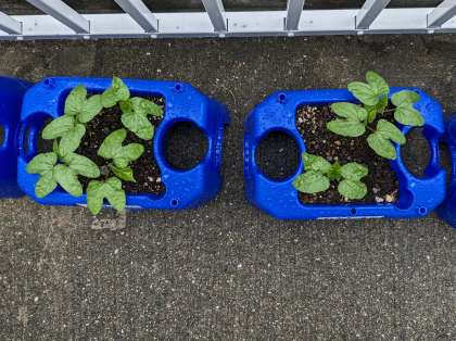 1年生が種をまいたアサガオに、毎日水やりをして、大きくなってきました。本葉が出始め、まもなくツルも伸びてくるでしょう。