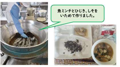 魚ひじきそぼろには、白身魚のスケソウダラをミンチ(ひき肉状)にしたものを使いました。魚ミンチとひじきをいため、砂糖、みりん、うすくちしょうゆで味つけし、最後にしそを加えていためることで風味を増しています。ごはんにかけて食べました。
