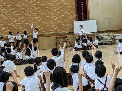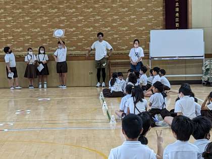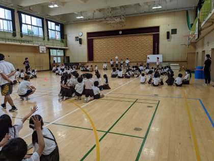 今日の集会は、じゃんけんゲームでした。集会委員会の工夫で、勝つと十円プレゼント、それを集めて、美味しそうな果物(イラストですが)をグループで集めるというルールでした。とても盛り上がって、じゃんけんに勝ったグループはガッツポーズでした。