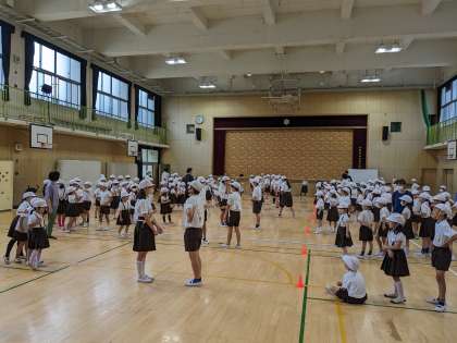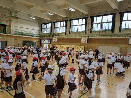 今日の集会では、じゃんけんゲームでした。各グループから一人ずつ出てきて互いに自己紹介して、じゃんけんをし、勝ったら帽子を赤に変えていきます。2週目には逆転をめざして、じゃんけんポン!