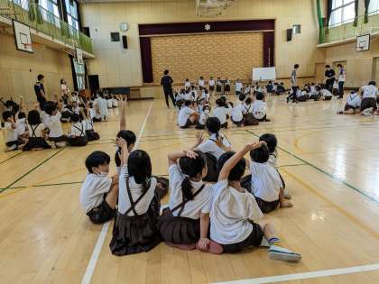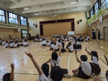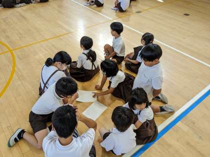 今日の児童集会では、文字の並べかえゲームをしました。プリントに書いてある文字をみんなで相談して、並べ替えて行きます。