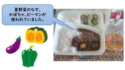 この日の給食は、夏野菜のカレーライス、キャベツときゅうりのサラダ、みかんゼリー、牛乳でした。