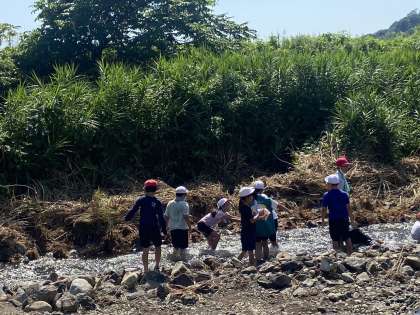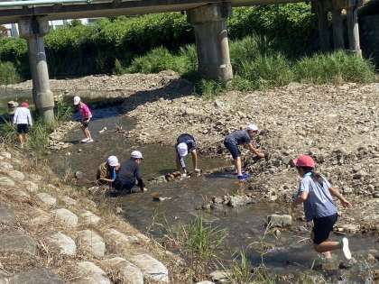 魚を食べたあとは、思い切り川遊びをしました。水をかけ合ったり、川の中で寝転んだりして、水の冷たさを楽しみました。