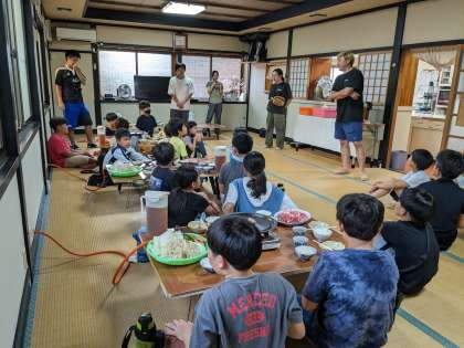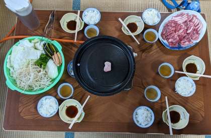 夕食は、お楽しみの焼き肉です。焼き方の説明を受けて、さあ、いただきます。