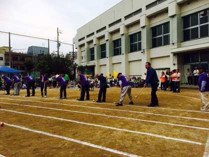 それぞれ、ゲートボールの距離と、スリッパ飛ばしの距離を競います。