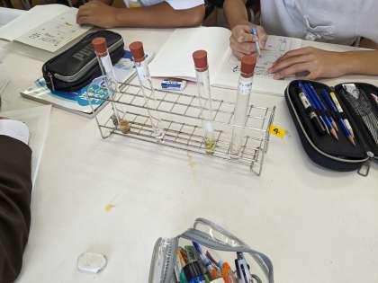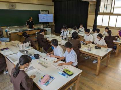 理科の時間は水溶液について学習しています。鉄やアルミニウムを水や塩酸につけておくとどんな変化が起こるのかを実験しました。今日はその結果から、考察を行いました。