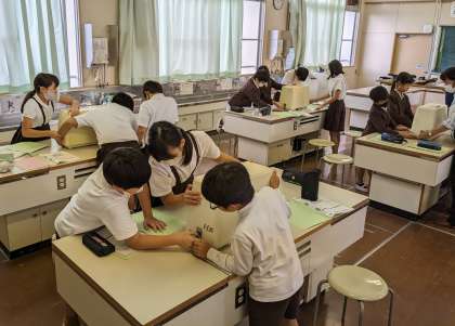 5年生は、初めてミシンを使いました。運ぶところから始めて、針の固定を確認し、スイッチを入れました。今日は糸はなしで、カラ縫いで縫う練習をしました。みんな、まっすぐに上手に縫いすすめていました。