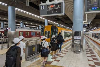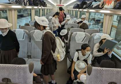 上本町に着き、特急電車に乗り込みました。早速、遊べる座席配置にして、2時間ちょっとの旅を楽しみます。