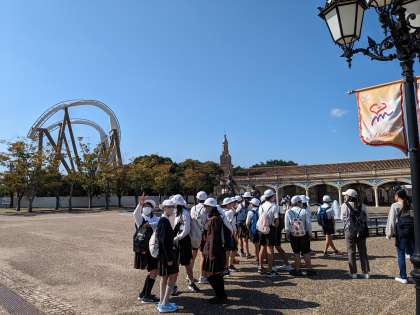 到着しました。青空がとてもきれいです。風はありますが、絶好の遊園地日和です。