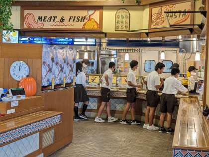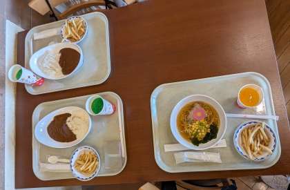 ラーメン、カレー、ハンバーグから自分で選んで、並んで受け取り運びます。