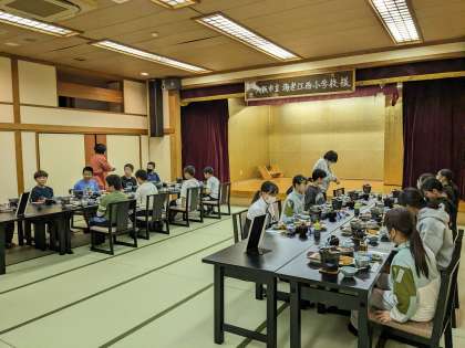 豪華な夕食をいただきます。正面には「歓迎 大阪市立海老江西小学校様」の看板もあって、子どもたちはちょっぴり緊張して入室しました。