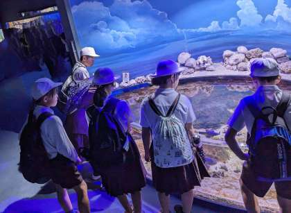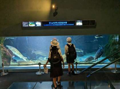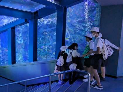 見学中、「ニモがいる!」「チョウザメって、卵、キャビアやんなあ」といろいろ感じたこと知ってることを話しています。