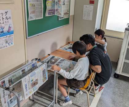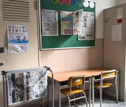 新聞コーナーが新しくなりました。子ども新聞を写真のように、教室の近くにおいて、子どもたちが手に取りやすいようにしてみました。