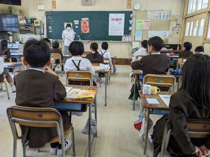 3時間目に、歯科衛生士さんに来てもらい、歯磨き指導をしてもらいました。歯垢を染め出し、赤くなっているところを確認して、自分の歯磨きの癖を確認し、磨き方を考えました。