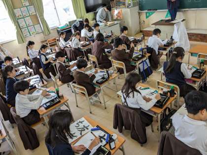 今日は3年生が書初めの練習をしていました。みんな背筋を伸ばして、良い姿勢で一筆一筆、ていねいに書いていました。次の習字のときには、縦に長いかきぞめ半紙に書きます。