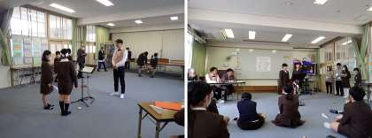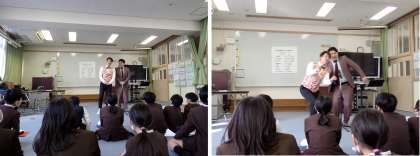 吉本興業から、漫才師『パーティーパーティー』のひらかわさんときむきむさんのお二人と作家さんが来てくださり、仕上げの練習を見てもらいました。プロの方にアドバイスをもらいながら、一生懸命練習しました。