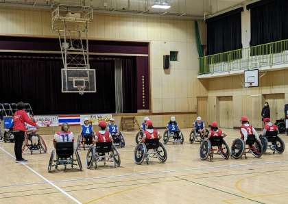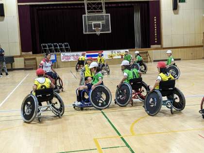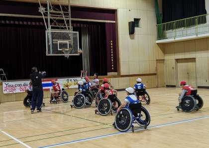次はゲームにチャレンジしました。車いすを走らせるだけでもたいへんですが、さらにボールをもって、パスして、それを受けてシュートするのは、なかなか難しかったです。しかし、子どもたちは、楽しそうに一生懸命車いすに乗ってボールを追いかけました。