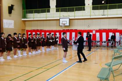 式終了後、教室でお別れをした卒業生が、講堂へ降りてきて、写真撮影をしました。その時、保護者の方と子どもたちから担任の先生に、サプライズで花を一人ずつ渡してお別れの言葉を伝えていました。