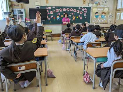 この時間は、自己紹介をしながら、話す、聞く練習をみんなでしました。このあと、一人一人が名前と好きな色を、前に出て大きな声で話をしていました。話し終わるとみんなから温かい拍手が自然とおこっていました。