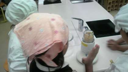 (1)大豆をミキサーですりつぶし、砂糖をまぜてきなこをつくる。