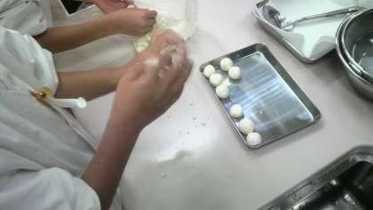 (3)耳たぶぐらいの柔らかさになった生地を2cmぐらいのだんごにして、熱湯に入れる。