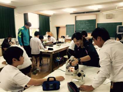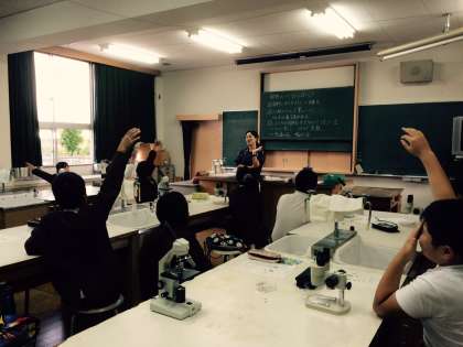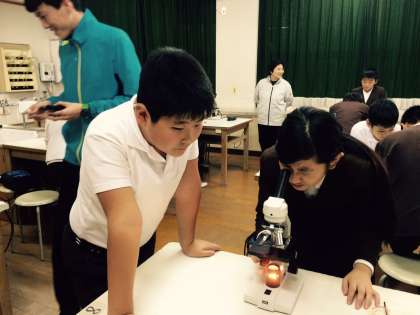 今年は、理科の実験をしました。この写真は、ミジンコを顕微鏡で観察しているところです。