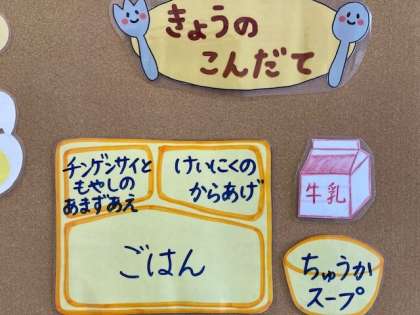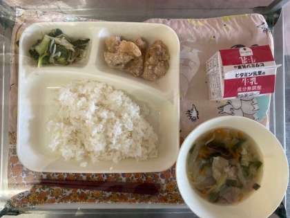 今日の献立の中には、子どもたちの大好きな「けいにくのからあげ」がありました。とてもおいしかったです。