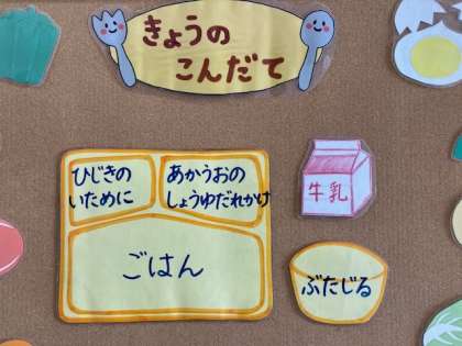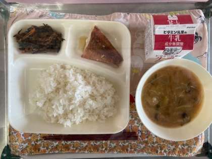 本日の給食食材の一つ「ひじき」は、こんぶやわかめと同じ海藻の仲間です。骨や歯を強くするカルシウム、おなかの調子を整える食物繊維などが多く含まれています。
