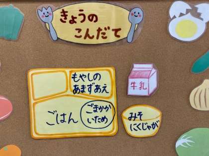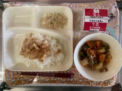本日の給食食材の一つ「たけのこ」は、4月から5月にかけてが旬(たくさんとれて、おいしい時期)の野菜です。主に食べているのは、竹の若い茎の部分です。