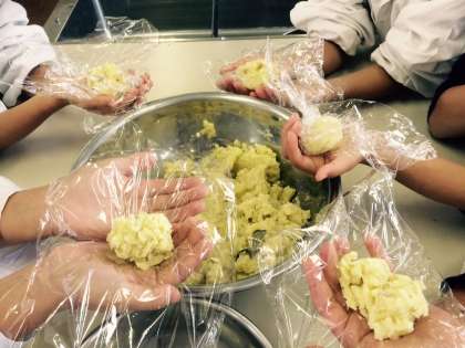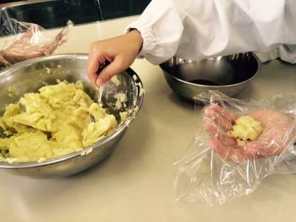 味付けをしたおいもをスプーンですくい、サランラッブにのせます。