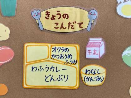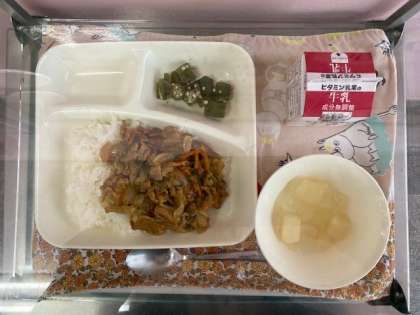 本日の給食食材の一つ「オクラ」のねばねばには、おなかの調子をよくする働きがあります。