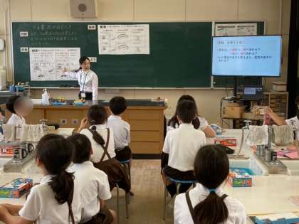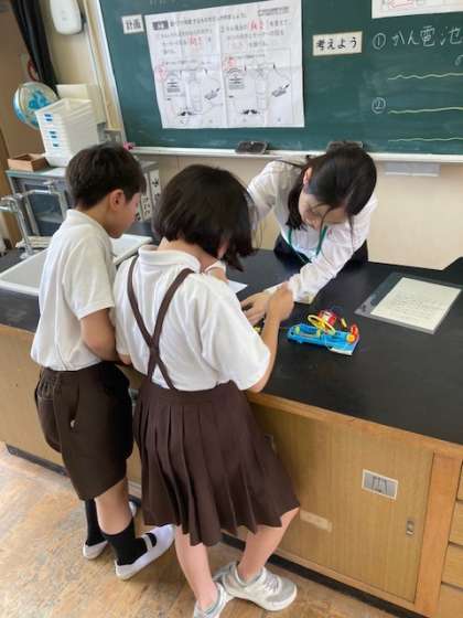 検流計を使って、本格的に電流の流れを確認する子どもたち。乾電池をつなぐ向きと、モーターの回る向きの関係について、予想を立ててから実験を行いました。