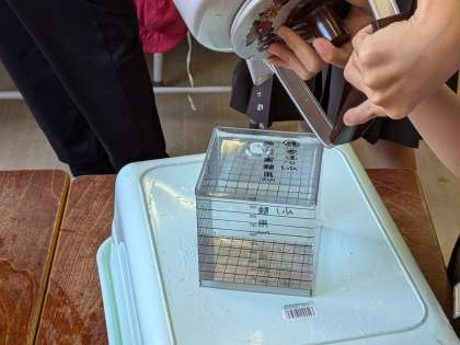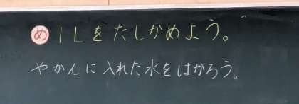 算数の時間に、みんなで1リットルの量を測ってみました。一人ずつやかんに自分が1リットルと思う量を入れてきて、グループで確認しました。ピッタリにするのはなかなか難しかったですが、みんな夢中で取り組んでいました。