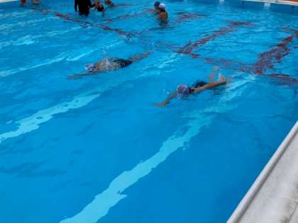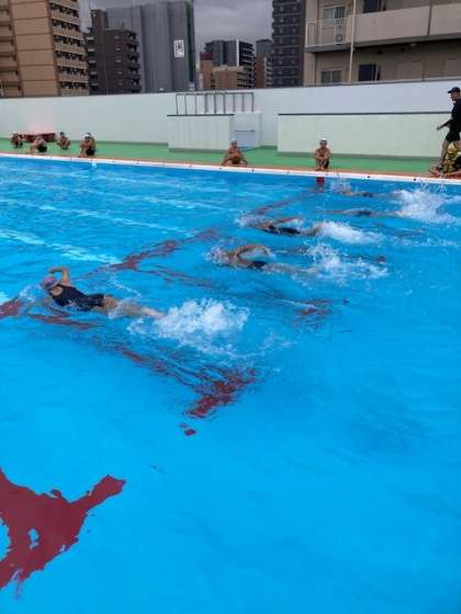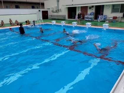 「がんばれ〜!もうすこし〜!」周りの友達から大きな声援が聞こえてきます。今日は5・6年生の児童が、泳力測定を行いました。そして、希望する児童には、25m・50mのタイム測定。50mを40秒台で泳ぐ児童もいました!