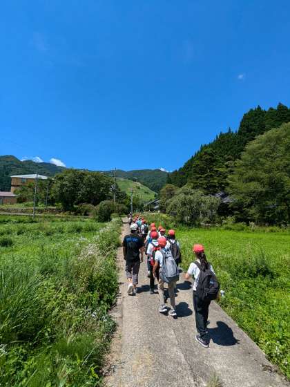 駐車場から青空の下、緑の中を歩いていきます。暑いですが、風が気持ちいいです。