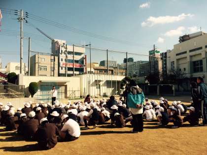 M8地震想定の避難訓練では、おはしもの約束を守り、2分3秒で素早く全員運動場に避難できました。