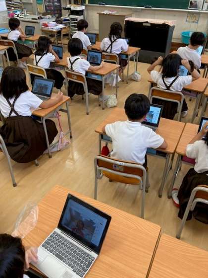1年生の子どもたちが別室にいる担任の先生とオンライン上でつながり、会話を楽しんでいました。学習参観後に行われるオンライン接続テストに向けて、準備万端です!