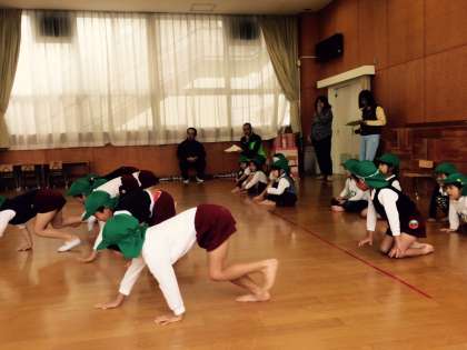 腕の力を使って、チーター(高這い)になって動いたり、キャタピラーゲームをしたりして楽しみました。