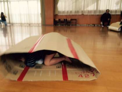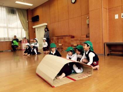 保育の最後に、活動のふりかえりをします。子ども達は、キャタピラー(ダンボール)がまっすぐに動くためには、どんなことに気をつけたらいいのか、自分の考えを発表していました。先生や友達の話を聞く力、自分の考えを話す力がついてきました。