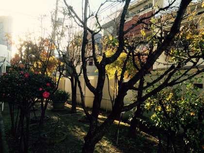 前庭の柿の木は、紅葉も過ぎ、冬の訪れを待っています。落ち葉のじゅうたんで前庭は敷き詰められ、朝日を浴びた前庭は、心がほっとするスペースです。