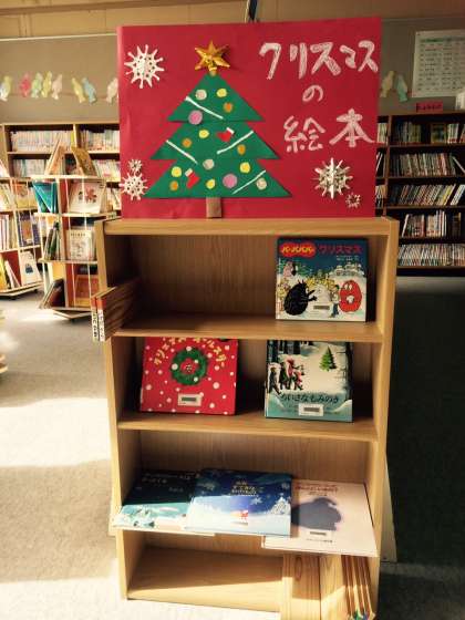 クリスマスの絵本の掲示物は、学校図書館補助員さんの手作りです。