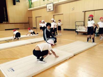 1年生の体育に、インターンシップの先生も入り、子ども達にアドバイスをしてくださっていました。