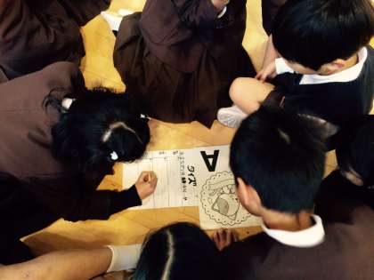 間違い当てクイズの形式で、問題が出され、たてわり班で答えます。